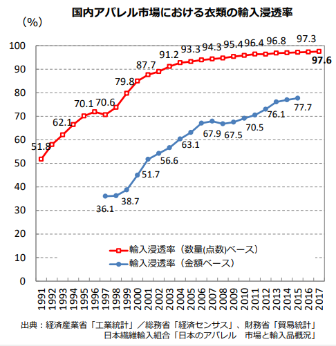 アパレル製品の実に約98%が海外生産となっていて、ほとんどの会社が海外生産や海外からの輸入商品に頼っていることになります。工場自体が減ってますので日本生産が今後急激に増えることもないため、貿易業務に関しての知識や経験のある人は今後も継続して求められます。